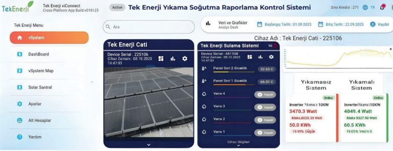 Sistem, kontrol panosu ve ilgili kontrol ekipmanları aracılığıyla otomasyon altyapısına entegre edilir. Web tabanlı arayüz üzerinden; sistemin çalışma durumu, güç tüketimi ve yıkama süreçleri uzaktan izlenebilir ve yönetilebilir.